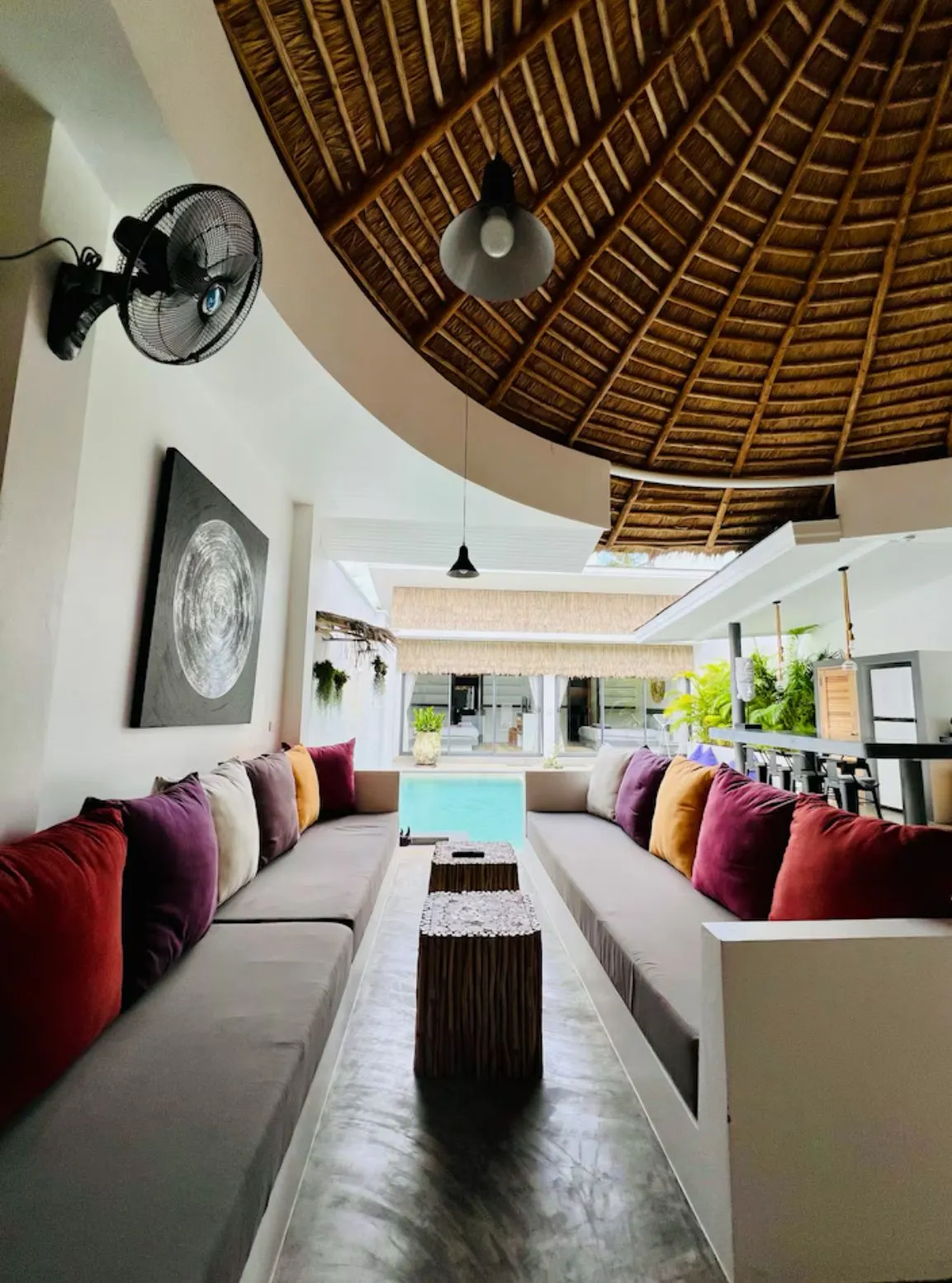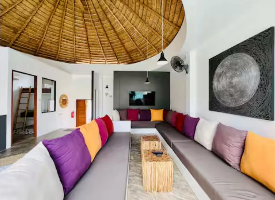 Le séjour ouvert sur l’extérieur bénéficie d’un toit à structure apparente recouvert de feuilles de yaka, qui apporte une touche tropicale unique et chaleureuse. La grande banquette intégrée offre un coin détente parfait pour partager des moments conviviaux.