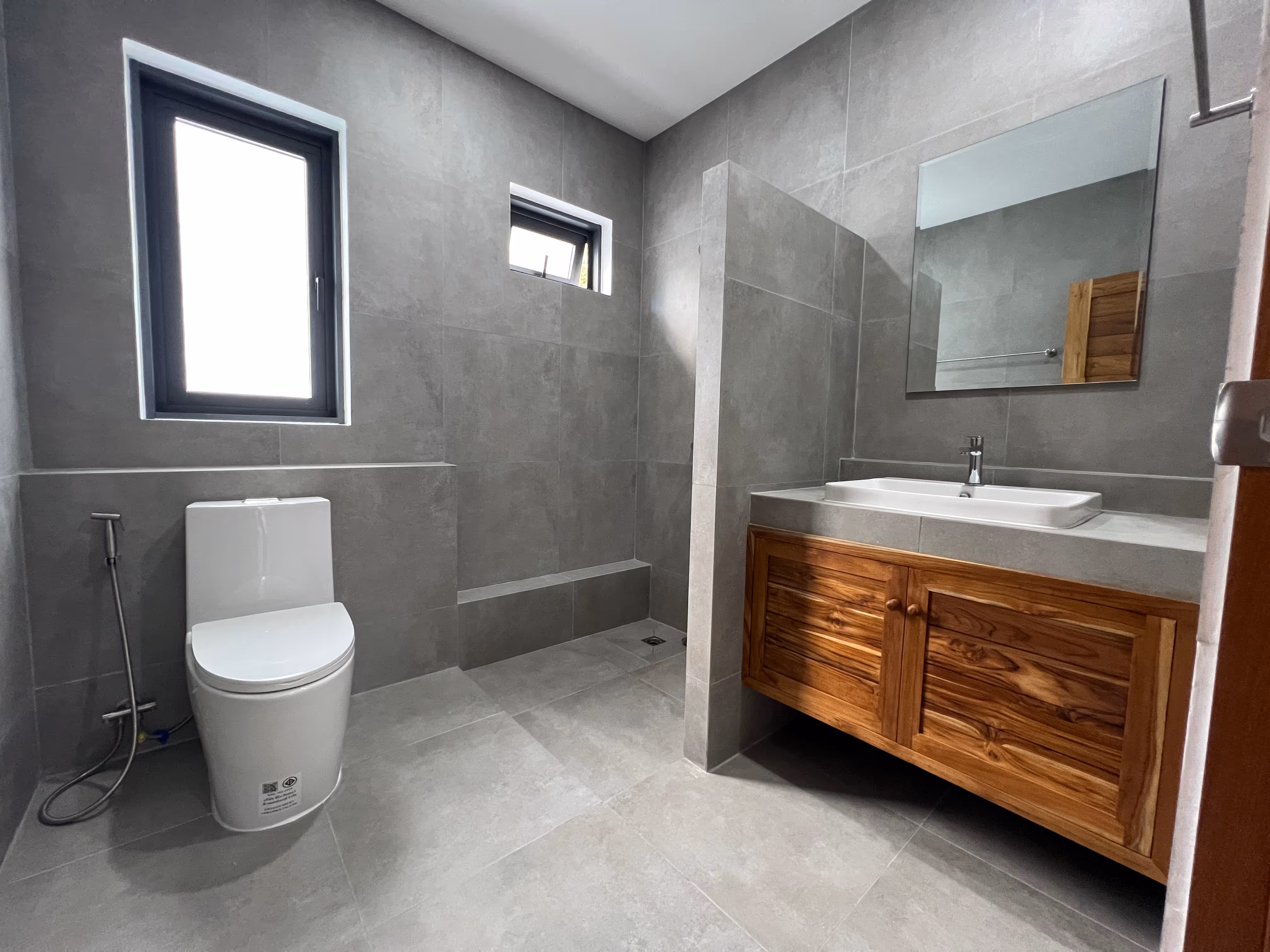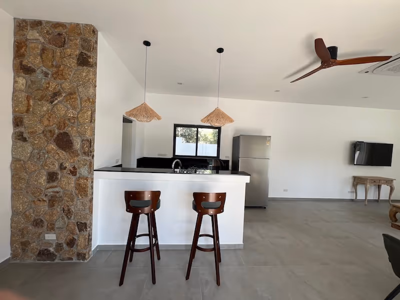 La villa propose une surface habitable de 128 m² et se compose de trois chambres climatisées, chacune disposant de sa salle de bain privative, dont une avec dressing indépendant. L’espace de vie, lumineux et bien agencé, réunit un salon et une salle à manger climatisé ouverts sur une cuisine moderne entièrement équipée. Un espace de rangement avec de grands placards vient compléter l’ensemble. Les parements en pierre, présents dans les espaces clés de la villa, apportent une touche élégante et du caractère à l’ensemble.